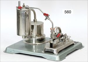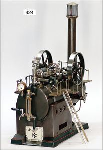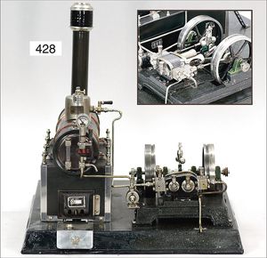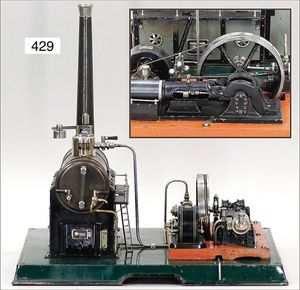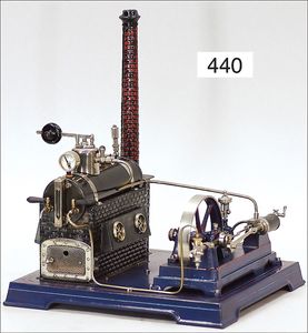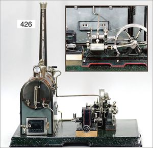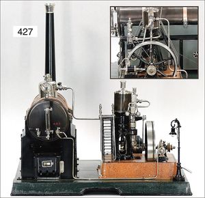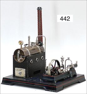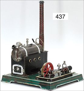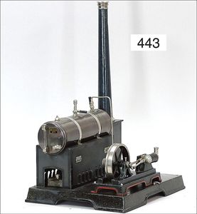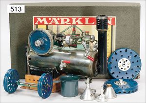 MÄRKLIN 4112/14, ca. 1923, Modell-Dampfmaschine, Grundplatte 37 x 41 cm, Kesseldurchm. 14 cm, Schornstein, Pfeife, Manometer, Wasserstandsglas, Fliehkraftregler, Speisepumpe, Transmission, Brenner fehlt, Schwungrad Durchm. 15,5 cm, bespielt., unberührter Orig.-Zust.
