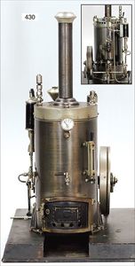 DOLL 510/4, ca. 1928, stationäres Lokomobil, 34 cm, Kesseldurchm. 10 cm, Messing brüniert, Schornstein, Fliehkraftregler, Pfeife, Manometer, Wasserstandsglas, Brenner, Leiter, guter Zust.