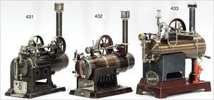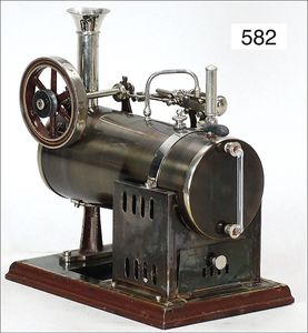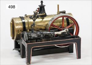 DOLL 368/3, ca. 1932, liegende Dampfmaschine, Grundplatte 30 x 33 cm, Kesseldurchm. 6,5 cm, Messing brüniert, Pfeife, Schornstein, Manometer, Wasserstandsglas, Fliehkraftregler, Brenner, kl. Lackfehler a. d. Bodenplatte, sonst guter Zust.