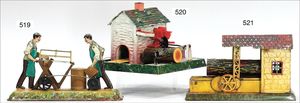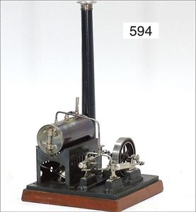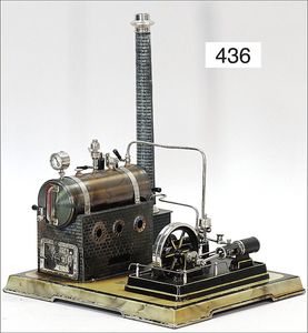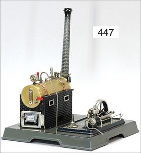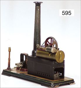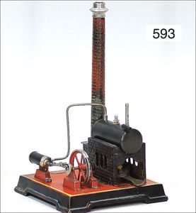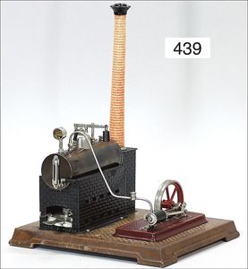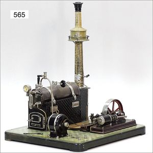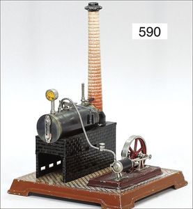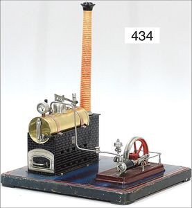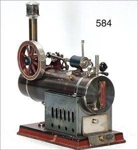 BING 130/584, ca. 1913, stationäres Lokomobil, 30 cm, Kesseldurchm. 7 cm, Messing brüniert, Pfeife, Wasserstandsglas, mit Schornstein und Brenner, Bodenplatte Blech lackiert, Schornstein etwas nachgelötet, sonst guter Zust.