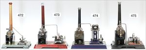 FALK 473/4, ca. 1928, stationäres Lokomobil, 23 cm, Kesseldurchm. 7 cm, Messing brüniert, Pfeife, Schornstein, Wasserstandsglas, Brenner, Bodenplatte Blech lackiert, guter Zust.