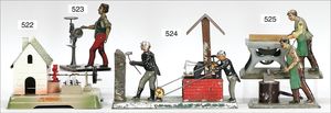 ELASTOLIN/LINEOL 6 Teile Bahnhofsfiguren, passend zu Spur 0, 6 cm, Masse, Zust. 3, dazu 1 Schlitten, Nachbau für DOLL rote Bahn