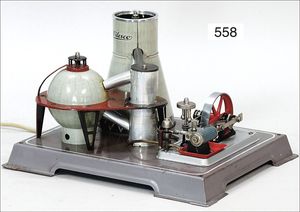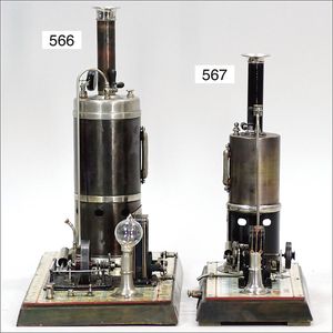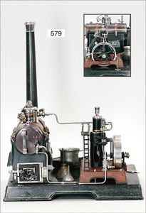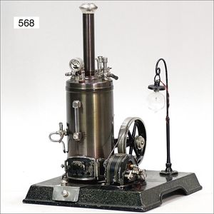 MÄRKLIN gr. Modell-Schiffsdampfmaschine, Grundplatte 50 x 47 cm, Kesseldurchm. 12 cm, Pfeife, Schornstein, Manometer, Wasserstandsglas, orig. Brenner, Fliegkraftregler, senkrecht laufender Zylinder, Schwungrad Durchm. 16 cm, Speisepumpe, Lampe, Dynamo, möglicherw. farbl. ausgebessert (wenn, dann sehr gute Arbeit), eine präsentative Dampfmaschine aus dem Hause Märklin
