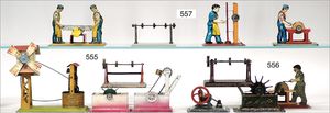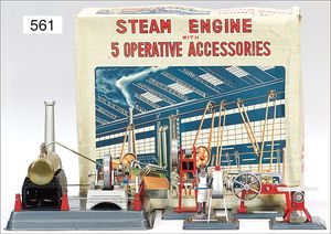 MÄRKLIN 4148/5,5, ca. 1919, liegende Dampfmaschine, Grundplatte 32 x 26,5 cm, Blech lackiert, Kesseldurchm. 5,5 cm, Messing poliert, Schornstein, Pfeife, Wasserstandsglas, Brenner (orig.?), Fliehkraftregler, Speisepumpe, altersbedingte Lackfehler a. d. Bodenplatte
