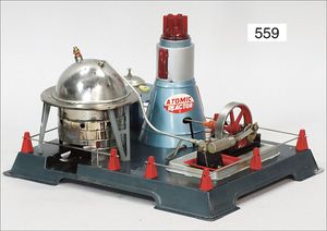 MÄRKLIN 4097/91/8, ca. 1939, Modelldampfmaschine, Grundplatte 35 cm x 35 cm, Blech lackiert, Kessel Messing, Durchm. 8 cm, Schornstein, Pfeife, Manometer, Brenner, Dynamo, Fliehkraftregler, Krakeleebildung an der Bodenplatte sonst guter Zust.
