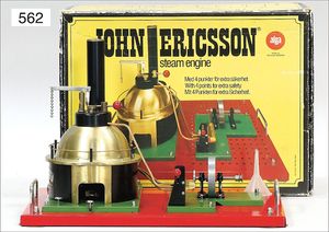 FALK 145/1, ca. 1930, liegende Dampfmaschine, Grundplatte 33,5 x 29 cm, Kesseldurchm. 7 cm, Messing brüniert, Schornstein, Pfeife, Manometer, Wasserstandsglas, Brenner (orig.?), Fliehkraftregler, Speisepumpe, altersbedingte Lackfehler a. d. Bodenplatte, sonst guter Zust.