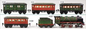 MÄRKLIN Spur 0, Zug bestehend aus 5 Personenwagen, 1727, 2-achsig, sehr guter Zust., davon 4 im Orig.-Kart., 1 Gepäckwagen, 1728, im Orig.-Kart., guter bis sehr guter Zust.