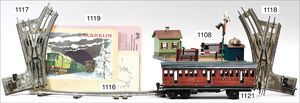 Fundkiste, KWN, 4 x 4-achsige Personenwagen, 1 x Gepäckwagen, dazu 1 Kipplore, 1 Weinfasswagen, sowie 1 Schlepptenderlok B, BING, nicht kompl.