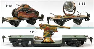 MÄRKLIN Spur 0, 1964/0M, Plattformwagen, Mimikry, mit Panzer, Panzerrohr nachtr. fest gelötet, Uhrwerk intakt, sonst insgesamt guter Zust., Schraube zwischen Wagen und Panzer fehlt, Orig.-Kart., ohne Deckel