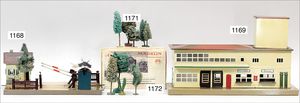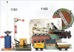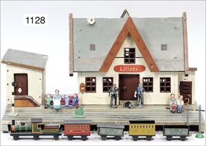 Bahnhof, Holz, 42 cm breit, 24 cm hoch, einige Masse-Figuren, 1 Zug PENNY TOY, Blech lithogr.