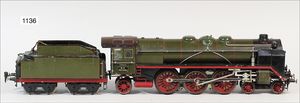 MÄRKLIN HR6612920, Schlepptenderlok, 2C1, 20 Volt, 4-achsiger Tender, HR929, 72 cm, kl. Windleitbleche, olivgrün/schwarz, Vor- und Rückwärts fahrend per Hand- und Fernschaltung, Trieb- und Kuppelstangen, imitierte Häusinger Steuerung, Galleriestangen, langes Führerhaus, Federpuffer, elektr. betriebene Laternen, Führerhausbeleuchtung, handlackiert, 1932, guter Zust., ein wenig Krakeleebildung, 2 Dome 1 x übermalt, kl. Stelle am Tender ausgebessert, sonst Orig.-Zust., techn. guter Zust.