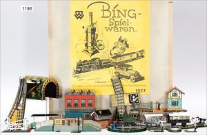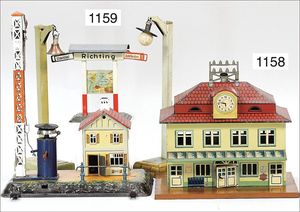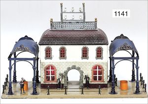 BING Bahnhof, mit 2 Bahnsteighallen, teils lithogr., teils handlackiert, Grundplatte 50 cm x 24 cm, Höhe 32 cm, dazu 3 Bahnhofsfiguren Heide, Guss, schöner Orig.-Zust.