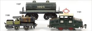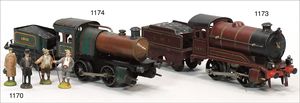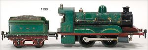 MÄRKLIN Spur 1, Schlepptenderlok B, Uhrwerk, grün/schwarz, mit roten Zierlinien, 37 cm, ein wenig Krakeleebildung, 1 Laterne fehlt, Orig.-Zust.