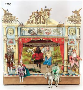 MÜNSBERG Marionetten-Theater, Figuren, Tschechei, Holz -Masse, ca. 21 Figuren und Tiere, mit Kulissen, 75 cm breit, ausgefallen