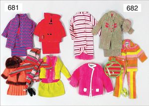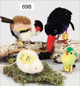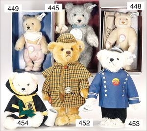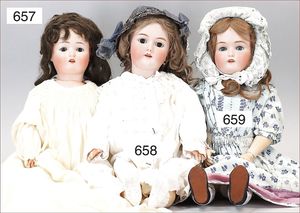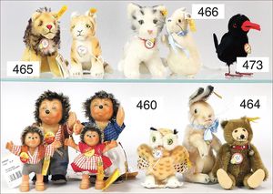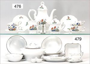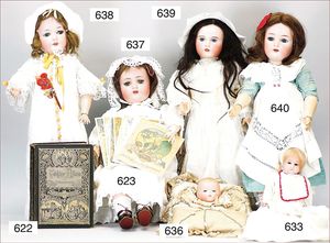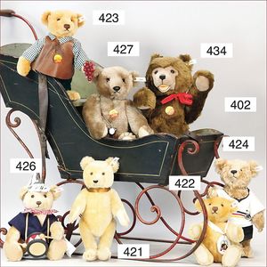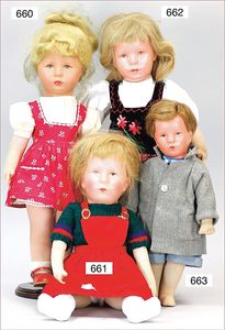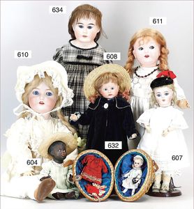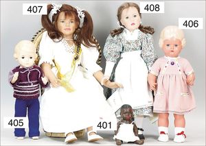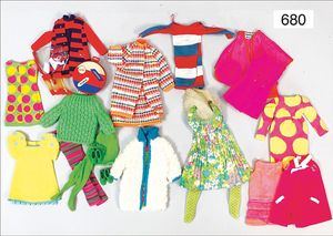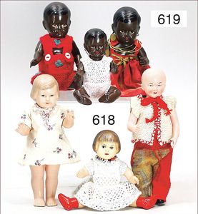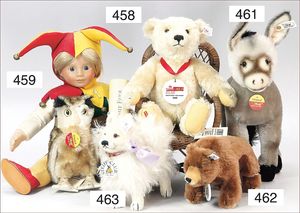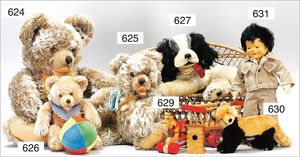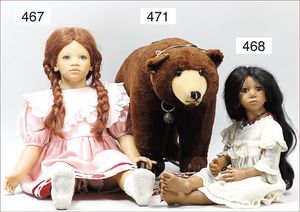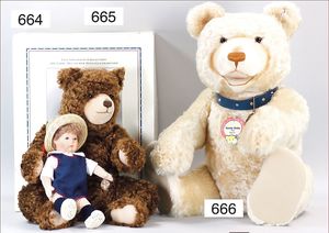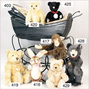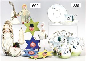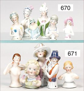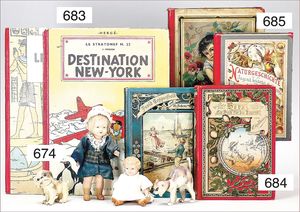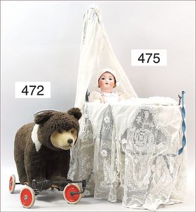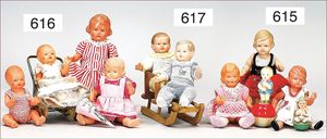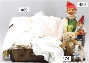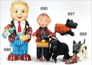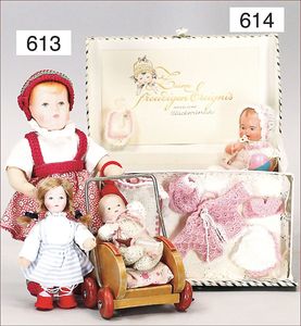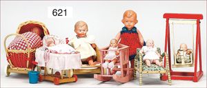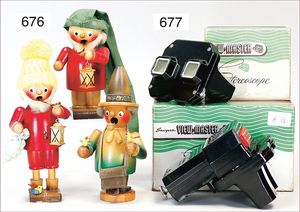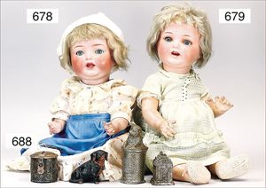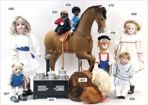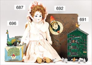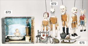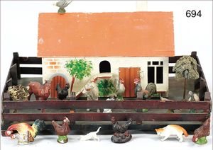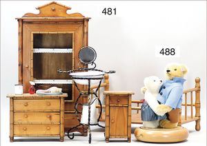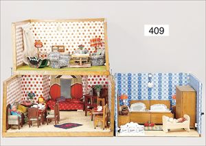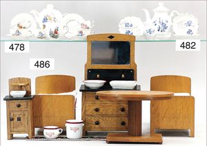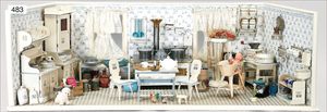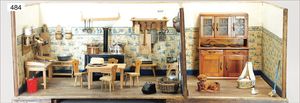 Puppenküche, Holz, Trapezförmig, Länge 1,16 m, Höhe 38 cm, Tiefe 54 cm, um 1910, mit reichh- Zubehör, Holzmobiliar, beige/blau bemalt, dazu 1 BING Herd, kompl., etwas Porzellan, 1 Blech-Brotdose, rund, einige Teile Steingut, Blecheimer mit Deckelaufschrif