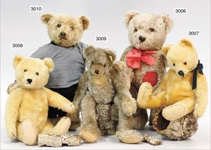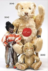 STEIFF Mittelkopfnaht-Bär mit Knopf, Schuhknopfaugen, Fehler an den Filztatzen, kl. Flickstellen, bis auf kl. Stellen Mohair in gutem Zust., an den Tatzen stark ausgegangen, bekleidet, 40 cm Stehhöhe, abgeriebene Nasenspitze, Rumpf fest gestopft