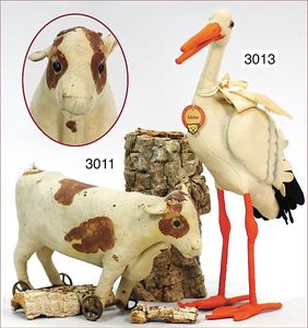 wohl STEIFF, Ochse, auf Guss-Speichen-Rädern, Filz, weiß/braun, Hörner und Schwanz fehlen, 30 cm lang, 17 cm hoch, Fehler am Filz, bespielt