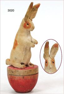 STEIFF Kegelspiel-Hase, ca. 1910, Samt, 12 cm stehend, 5 cm, Holzkegel, ausgefallenes Teil der Steiff-Produktion