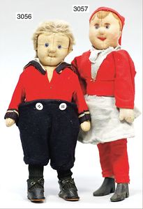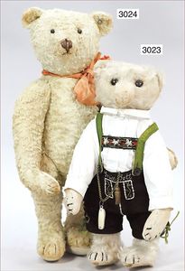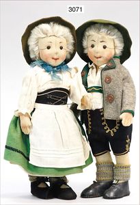 STEIFF Puppen-Paar, Anton und Lisl (Oberbayer/in), Lisl mit Knopf, langgezogenes F, eingesetztes Haarteil mit langen Haaren, Filz-Gesicht, -Hände sowie -Füße, in gutem Zust., schöne deutliche Bemalung, Kleidung in gutem Zust., ca. 1910, Anton mit Knopf, langgezogenes F, Filz-Gesicht, -Arme und -Beine, in gutem Zust., schöne Bemalung, eingesetzte lange Haare, Orig.-Kleidung, 28 cm, ausgef.