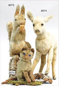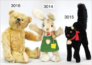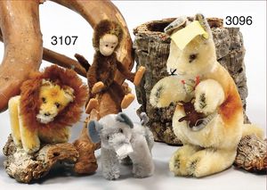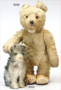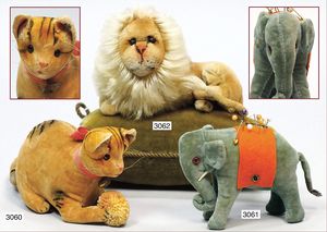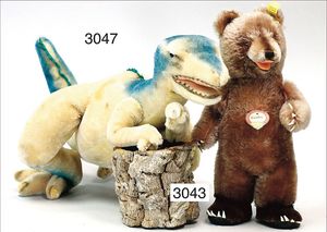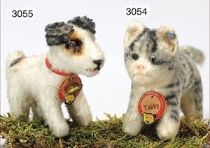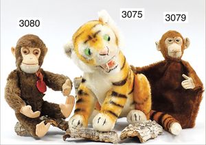 STEIFF Mascot-Tiger, ca. 1950, mit Knopf, minim. Reste der gelben Fahne, Schielaugen, grün unterlegt, sitzend, Höhe 24 cm, drehbarer Kopf, guter Zust.