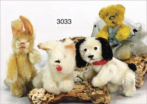 STEIFF Cockerspaniel, sitzend, 16 cm, mit Musikspielwerk, mit Knopf und Fahne, Nr. 3317, 3, schwarz/weißes Mohair, drehbarer Kopf, ausgefallen
