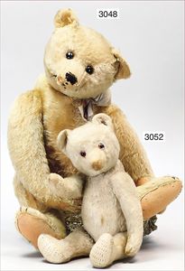 Bär wohl SONNEBERG, schw. Nasenbestickung, Glasaugen, 83 cm, leicht abgeknickte Arme, etw. verstaubt, maisfarben, minimale Fehler an den Filztatzen, sonst guter Zust.