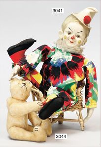 STEIFF Kasperl-Clown (auch genannt BiBaBo), ca. 1928, mit Knopf, langgezogenes F, Hut ergänzt, Filz-Gesicht und -Hände, schöne Bemalung, gelbes Mohair, Rock aus buntem Stoff, 17 cm