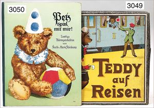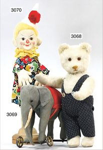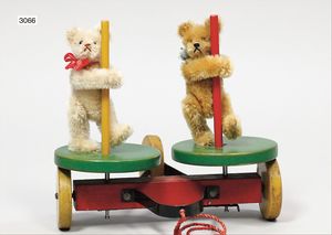 STEIFF Roly-Droly, 2 Teddybären, ca. 1924, 1 x gold/gelb, mit Knopf, langgezogenes F, 1 x weiß, mit Knopf, langgezogenes F, auf Drehscheibe des 3-rädrigen Wagens, 16 cm breit, beim ziehen drehen sich die Tiere gegeneinander, mit Zugleine, Wagen leuchtend lackiert, extrem selten, ausgef.