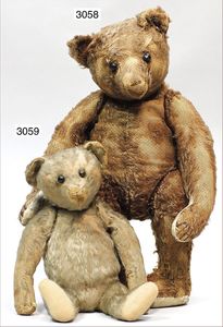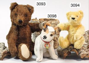 STEIFF Konv. 2 Orig.-Bären, 1 x weißes Mohair, mit Brustschild, 14 cm, guter Zust., 1 Bär mit Knopf, Schild und Reste der gelben Fahne, 14 cm, caramellfarben