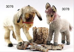 STEIFF Mascot-Esel, um 1950, mit Knopf und Fahne, Nr. 1328,0, US-Zone, Schielaugen, rot unterlegt, stehend, Höhe 20 cm, Länge 32 cm, off. Maul, Filz unterlegt, guter Zust.