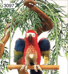 STEIFF Papagei Lora, mit Knopf, Schild und Fahne, Nr. auf der Fahne 1312,08, ausgefallenes Teil der STEIFF-Produktion, auf Vogelschaukel, 13 cm hoch, etw. verstaubt, sonst guter Zust.