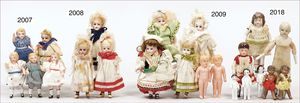 4 Ganzbiskuit-Kinder, anmodellierten Schuhe und Strümpfe, Glasaugen, fest aufgeklebte Perücken, 8 cm - 9 cm,1 kl. Badepüppchen, 2 Celluloid-Püppchen