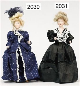 Konv. 2 Biskuitporzellan-Brustblattkopf-Puppenstuben-Puppen, 1 x blonde Hochsteckfrisur, gemalte Augen, Biskuit-Unterarme und -Beine, Stoffkörper, 12 cm, Kleidung aus altem Nesselstoff, 1 x Haushälterin, Biskuitporzellan-Brustblattkopf, Hochsteckfrisur, blaue gemalte Augen, Biskuit-Unterarme, 1 Arm fehlt, Biskuit-Beine mit anmodellierten Schuhen, 13 cm, alte Kleidung