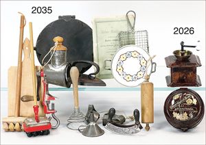 Küchenzubehör, Handtuchhalter mit 4 Haken,11 cm,1 Brotdose "Unser tägl. Brod gib uns heute", Durchm. 8 cm, Wärmflasche, Durchm. 3,5 cm, Waffeleisen, Klappstuhl, ausklappbar zur Leiter, Holz, 13 cm hoch, kl. Blech-Dose lithogr., 2 cm