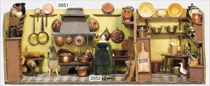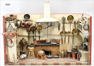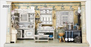 GOTTSCHALK Küche, Jugendstil, 83 cm breit, 48 cm hoch, 44 cm tief, Orig.-Tapete, Holländer-Motiv, original möbliert, Schrank, Regale, Kommode, Waschtisch, kleiner Vorratsschrank, reichh. Zubehör, Butterdose, Wandkaffeemühle, Brotdose, Porzellan-Teile, Blech-Dosen, einige Teile blau/weiß emailliert, Essig- und Öl-Karaffe, Tellerwaage, passender Puppenküchen-Herd, ca. 1910, Holz-Spannungsrisse am Boden, insg. schöner Orig.-Zust.