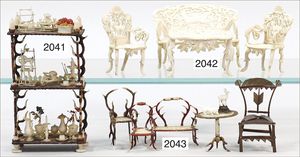 außergew. Sitzgruppe, filigrane Beinarbeit, Wildszene, Bank, 8,5 cm, 2 Stühle, 1 Tisch, für kl. herrschaftl. Wintergarten oder Puppenstube