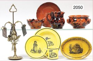 Konv. Keramikteile, ausgefallen, grün lackierter Trinkbecher, 1,5 cm, dazu passende Karaffe mit montiertem Zinn-Deckel, 4,5 cm, Bowle-Set, grünes Glas auf Zinn montiert