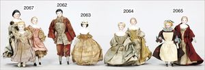 Konv. Puppenstuben-Puppen, 4 kl. Nacktfrösche, 3,5 cm, 6 cm, 2 Masse-Puppen, dunkelhäutig, 4 cm, 2 Ganzbiskuit-Puppen, Kinder, anmodellierte Schuhe und Strümpfe, 6 cm, Puppenstuben-Puppe, Stoffkörper, Biskuit-Brustblatt-Kopf, -Arme und -Beine, 1 Fuß abgebrochen, 10 cm