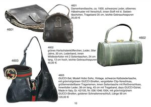 Damenhandtasche, ca. 1930, schwarzes Leder, silbernes Häkelmuster mit Verschluß, innen Stoff mit kl. Seidentäschchen, Trageband 20 cm, leichte Gebrauchsspuren
