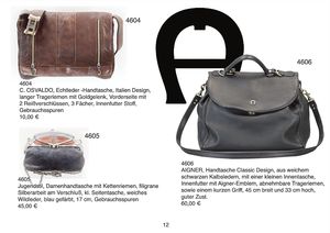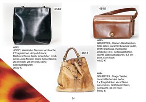 GOLDPFEIL 1 ausgefallene Damenhandtasche, markiert Modell Goldpfeil, Farbe Tan, ca. 60er Jahre, festes Leder, ausgefallener Verschluß mit Orig.- Schlüssel, Innenfutter Stoff, Orig.- Goldpfeilmuster, Lederhenkel, Gebrauchsspuren, 33 cm breit, 20 cm hoch, dazu 1 Goldpfeilhandtasche, Leder mit Gebrauchsspuren, Druckknopf, Innenmuster, Stoff-Goldpfeilmuster, Zusatz-Verschluß mit Lederband, 31 cm hoch