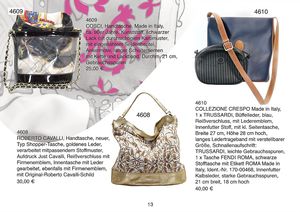 Konv. 2 Handtaschen, COLLEZIONE CRESPO Made in Italy, 1 x Lederhandtasche TRUSSARDI, Büffelleder blau, Reißverschluss mit Lederemblem, Innenfutter Stoff mit kl. Seitentasche, Breite 27 cm, 28 cm hoch, langes Ledertrageband mit verstellbarer Größe, Schnallenaufschrift TRUSSARDI, leichte Gebrauchsspuren, dazu 1 Tasche FENDI ROMA, schwarze Stofftasche mit Etikett ROMA Made in Italy, Ident.-Nr. 170-00468, Innenfutter Kalbsleder, starke Gebrauchsspuren, 21 cm breit, 18 cm hoch