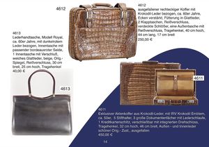 Exklusiver Aktenkoffer aus Krokodilleder, mit IRV Krokodil Emblem, ca. 50er, 5 Stifthalter, 3 große Dokumentenfächer mit Lederschlaufe, 1 Kreditkartenschlitz, verschließbar mit intigrierten Drehschloß, Tragehenkel, 32 cm hoch, 46 cm breit, Außen - und Innenleder schöner Orig.- Zust., ausgefallen