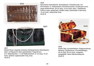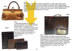 feine flache Abendtasche, Brandyfarben, Krokodil-Leder, mit IRV-Emblem, kl. Seitentasche mit Reißverschluß, Druckknopf vorne, lange Kettenhenkel, 29 cm lang, 15 cm hoch, dazu 1 Geldbeutel, Python-Leder, gestempelt, Golden Head, Handmade in Germany, 13 cm hoch, unberührter Zust.