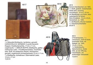 ausgefallenes Konv. Damen-Handtaschen um 1890, 1 x Stoffhandtasche gestickt, Gobelinarbeit, Seide teilw. ein wenig verschlissen, 18 cm x 18 cm, mit Metallbügel und Kette, dazu 1 Ledertasche mit feinen Stick-Einsätzen, 18 cm x 8 cm Handarbeit, ca. 1890, 1 x Stofftasche Blumen bestickt, 1 Taschentuchbehälter
