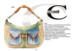 ROBERTO CAVALLI Handtasche, neuer, Typ Shopper-Tasche, goldenes Leder, verarbeitet mit passendem Stoffmuster, Aufdruck Just Cavalli, Reißverschluss mit Firmenemblem, Innentasche mit Leder gearbeitet, ebenfalls mit Firmenemblem, mit Original-Roberto Cavalli-Schild