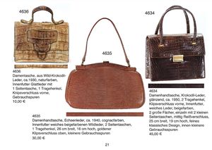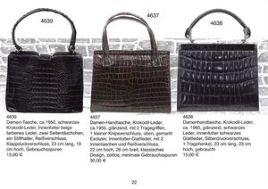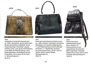 Ausgefallene Krokodil-Damentasche, ca. 1945, naturfarbend, grobe große Naht, Größe des Hänkels verstellbar, Druckknopfverschluss, Innenfutter: graues weiches Leder, zwei große Innentaschen, in der Mitte ein Reißverschluss, zwei Seitentäschchen, Krokodilkopf auf der Forderseite, 28 cm lang, 30 cm hoch, kl. Gebrauchsspuren