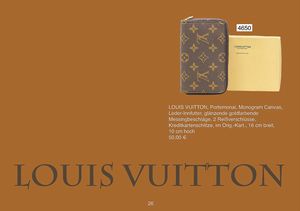 LOUIS VUITTON Portemonai, Monogram Canvas, Leder-Innfutter, glänzende goldfarbende Messingbeschläge, 2 Reißverschlüsse, 6 Kreditkartenschlitze, im Orig.-Kart., 16 cm breit, 10 cm hoch, passend zu 4649