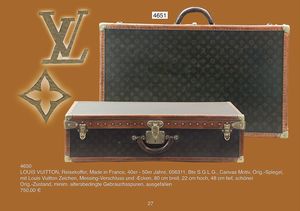 LOUIS VITTON Reisekoffer, Made in France, 40er bis 50er Jahre, 056311, Bte S.G.L.G., Canvas Motiv, Orig. Siegel, mit Louis Vitton Zeichen, Messing Veschluss und Messingecken, 80 cm breit, 22 cm hoch, 48 cm tief, schöner Orig. Zustand, minimale altersbedingte Gebrauchsspuren, ausgefallen