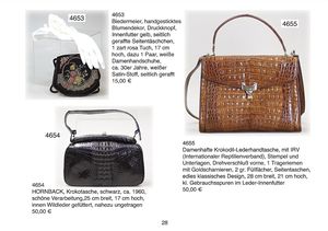 Damenhafte Krokodil-Lederhandtasche, mit IRV (Internationaler Reptilienverband), Stempel und Unterlagen, Drehverschluß vorne, 1 Tragehenkel mit Goldscharnieren, 2 gr. Füllfächer, Seitentaschen, edeles klassisches Design, 28 cm breit, 21 cm hoch, kl. Gebrauchsspuren im Leder-Innenfutter