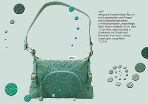mintgrüne Straußenleder-Tasche, mit Goldschnallen und Ringen, mit Außenseitentäschchen, 2 Reißverschlüssen, innen beiger Stoff, Ecken verstärkt, 25 cm breit, 15 cm hoch, dazu passend kl. Geldbeutel mit Druckknopf, 8 cmbreit, 6 cm hoch, beides ungetragen, ausgefallen